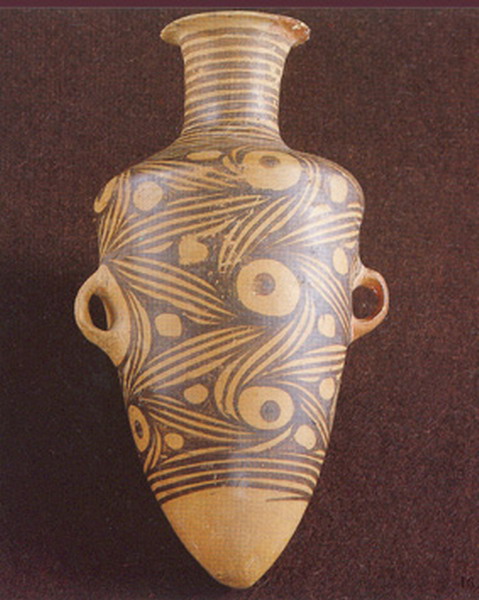 马家窑类型的彩陶图案常以密集的平行、弧曲、交叉、同心圆、涡漩的线条为主,表现出一种富有韵律的动感。图案布局多根据器形设计,窄长的瓶、壶图案多作横分层和散点式的排列,大型陶器的图案多层排列,而小型陶器往往通体绘满花纹。 我们从“漩纹尖底瓶”上所绘多重的平行线条和四方连续旋纹饰中,可以感受到如涡漩飞转、水珠四溅的情景。“圆点网纹瓶”以变体叶纹、圆圈、弧线三角、网纹为饰,其颈部的平行线,腹部的水波纹和圆点纹,似乎象征着洮河的波流。 但是,马家窑类彩陶纹饰,仍然以几何纹为装饰主体,最具代表性的几何纹是旋纹,多以同心圆为中心组成图案,运用直线与曲线的组合,所以产生出一种强烈对比的艺术效果,几何纹饰善于利用曲折起伏的线条与旋转多变的构图,使整个画面产生一种飞扬流动的节奏感。 在马家窑类型的彩陶图案中,也有少量的动物纹,但多被神化了,有些是被人格化了的神灵,有些则是不同动物的某些部分的混合体,或者将动物躯体加以取舍和夸张。 总之,马家窑类型彩陶图案,最突出的特点是旋动,或来往反复,或盘旋回转,或交错勾连,流利生动,结构巧妙,在强烈的动感中给人以美的愉悦和享受。所以,马家窑类型彩陶是先民最富有艺术性的创造,是我国绘画史上现存的最古老的艺术品之一。这一朵朵绚丽璀璨的艺术之花,在人类文明的史册里永放异彩!在我国彩陶文化史上,马家窑文化彩陶造型优美,花纹绚丽多姿,色彩厚重浓烈,色调单纯明快,用笔飞动流畅,构图细密严谨,器形丰富多样,技巧精湛熟练,以独特的造型能力和表现手法在新石器时代中晚期的彩陶文化发展历程中具有里程碑意义,不仅意味着中国彩陶艺术发展的顶峰,同时也说明中国艺术在史前时代就已经取得了相当高的成就。 马家窑文化发展到半山期,其造型和纹饰有了进一步的繁荣,具有鲜明的特色。半山类型彩陶器形主要有壶、罐、杯、钵等,以壶类为最多,其造型特点是直口、长颈、广肩。流行大型的小口高领,鼓腹双耳和侈口短颈鼓腹双耳瓮,部分彩陶的颈部上端有对称的鸡冠状盲耳。如果说马家窑类型的彩陶造型以独具特色的瓶为典范的话,那么,半山型的特征首先表现在壶和罐的造型上。壶和罐作为这一类型中最主要的器形,其最突出之处是鼓腹。器物腹部向外作最大弧度的膨圆,近似球形,并具有折肩、鼓腹、敛底等特征,通常显得矮胖、敦实。一般在球形体基础上加长颈为壶,短颈为罐、瓮等。这种浑圆、凝重、饱满的风格,构成了半山类彩陶器形独具的特色。 这种器形和与之相得益彰的纹饰,组成了半山类彩陶和谐融合的完美有机体。它的最大特色是:常用黑红两色相间的线条,勾画出各种各样的花纹图案。绘饰主要有螺旋纹、菱形纹、圆圈纹、葫芦纹、同心圆纹、折线三角纹、平列弧线纹、网纹、锯齿纹、贝纹等。其中数量最多的是锯齿状线条勾画出的四方连涡形纹,但旋心扩大,内饰各种精细的花纹,也有以饰有花纹的图案带来连接旋纹的旋心。这种花纹中套花纹的装饰手法,使图案显得繁茂绚丽。其次出现的还有葫芦网格纹、菱形花格纹、圆圈网格纹、连弧纹等。到了晚期,半山彩陶纹饰多绘以二方连续的四大圆圈纹,以及由此发展起来的四大圈纹,并常常在四大圈纹中饰以网格纹、棋盘格纹、菱格纹、斜锯齿带纹、小圆圈和点纹等,并在四大圈的外框和颈肩之交置以黑锯齿带和红线。 半山类型彩陶纹饰花纹精致,色彩富丽,严谨规整,表现手法繁复多样。绝大多数纹饰的构图,无论正视、侧视或俯视,都可构成优美的画面,并具有很强的装饰效果,丝毫不显呆滞笨拙。 马厂类型是在半山类型彩陶的基础上发展起来的,但在器形上,仍有自己的造型特色。根据其风格的变化,马厂彩陶可分为早、中、晚三期。 早期陶器以彩陶双耳罐、小粗陶双耳罐为主,双耳彩陶壶体形矮胖,短颈侈口,长颈彩陶壶多直口,某些要素和半山陶器颇类似。 中期彩陶数量大增,彩陶双耳罐数量减少,彩陶壶由肥变瘦,颈部逐渐加长,腹微内收。