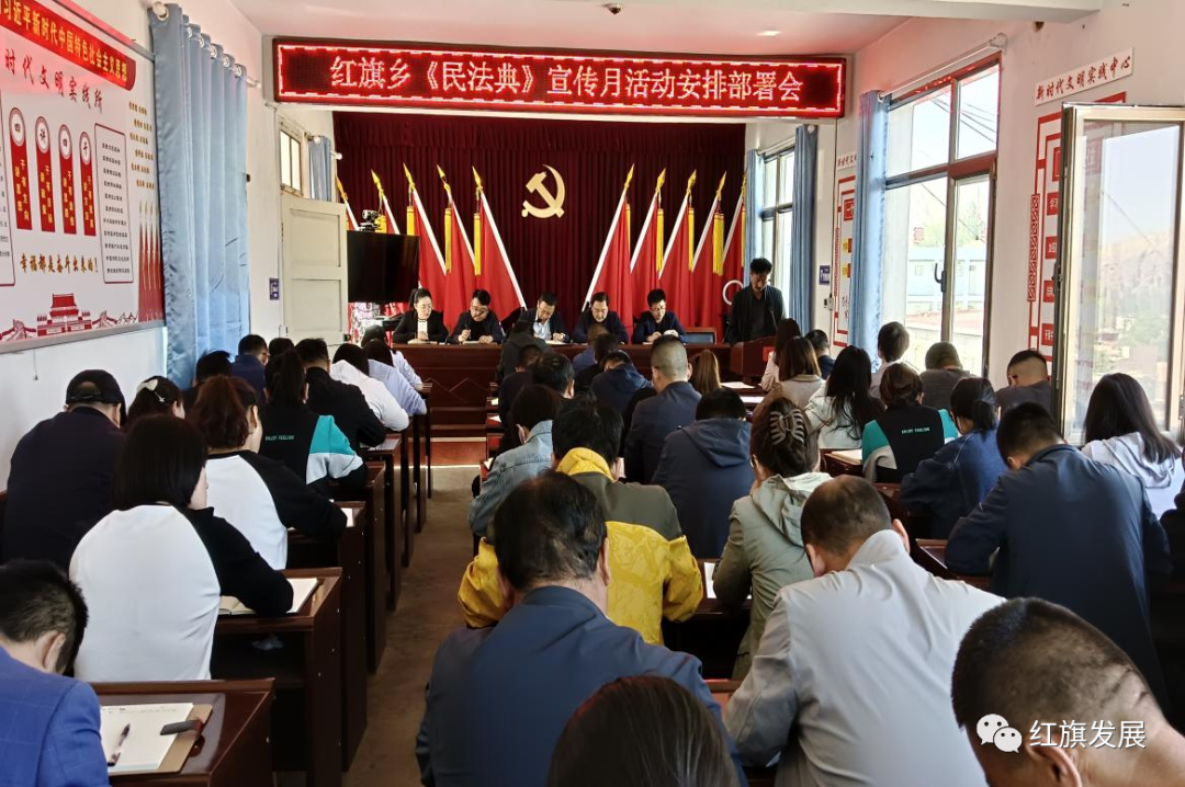 明法于心,守法于行,为切实将民法典条款落地生根,五月,正值我国第三个“民法典宣传月”之际,红旗乡在辖区内开展了民法典宣传月系列宣传活动,以此增强人民群众的学法守法意识,实现民法典普法宣传全覆盖。 一是精心安排部署。乡党委召集村党支部书记、全体乡干部组织召开了《民法典》宣传月活动安排部署会议,对宣传内容及方式做了要求。